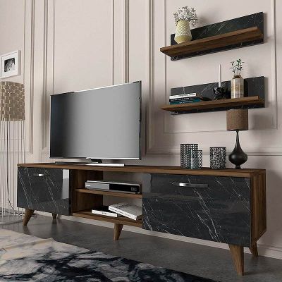 18. Έπιπλο τηλεόρασης Colin Megapap από μελαμίνη χρώμα καρυδί - μαύρο εφέ μαρμάρου 150x30x40,6εκ.