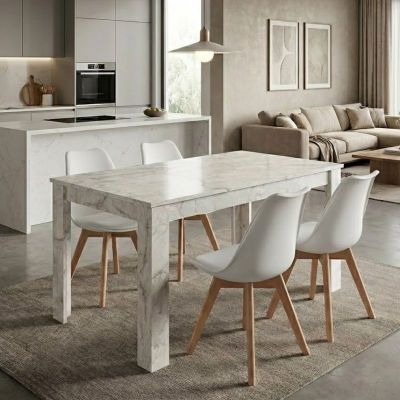 Σετ τραπεζαρία 5τμχ Darlen - Viva Megapap χρώμα λευκό εφέ μαρμάρου - λευκό/φυσικό πόδι 125x72x74εκ.