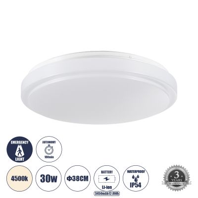 8. GLOBOSTAR® EMERGANO 60993 Φωτιστικό Πλαφονιέρα Οροφής με Ενσωματωμένο Σύστημα Emergency Li-ion 3450mAh/12.8Wh με Αυτονομία 3hrs LED 30W 2850lm 120° AC 220-240V Αδιάβροχο IP54 Φυσικό Λευκό 4500K - Lumileds SMD Chip - Λευκό Γαλακτερό - Μ38 x Π38 x Υ5.3cm -