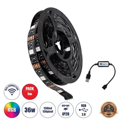 21. GLOBOSTAR® 90759 Σετ RGB Ταινίας με Λειτουργία μέσω WiFi APP LED 36W/5m 2880lm/m 120° DC 5V με USB 2.0 IP20 150 x SMD 5050 Chip/5m Πολύχρωμο RGB Dimmable - Μ500 x Π1 x Υ0.2cm - Ρολό 5 Μέτρων - 5 Χρόνια Εγγύηση