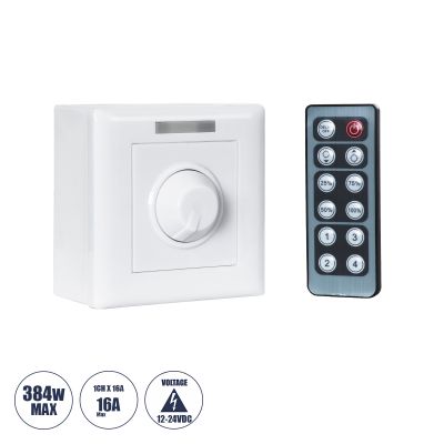 6. GloboStar® 73317 Επιτοίχιο Dimmer με Ασύρματο Χειριστήριο RF DC 12-24V για Μονόχρωμα Προϊόντα LED 16A Max 384W Μ9 x Π9 x Υ4.5cm - 2 Χρόνια Εγγύηση